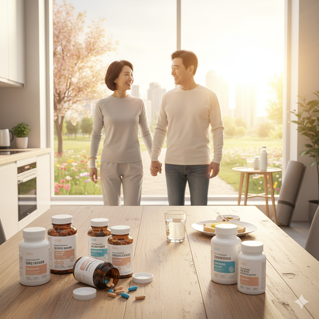 이런 변화는 “식사만으로는 채우기 부족한 영양소”가 많아지는 시기라는 의미예요. 그래서 영양제 조합이 꼭 필요합니다.