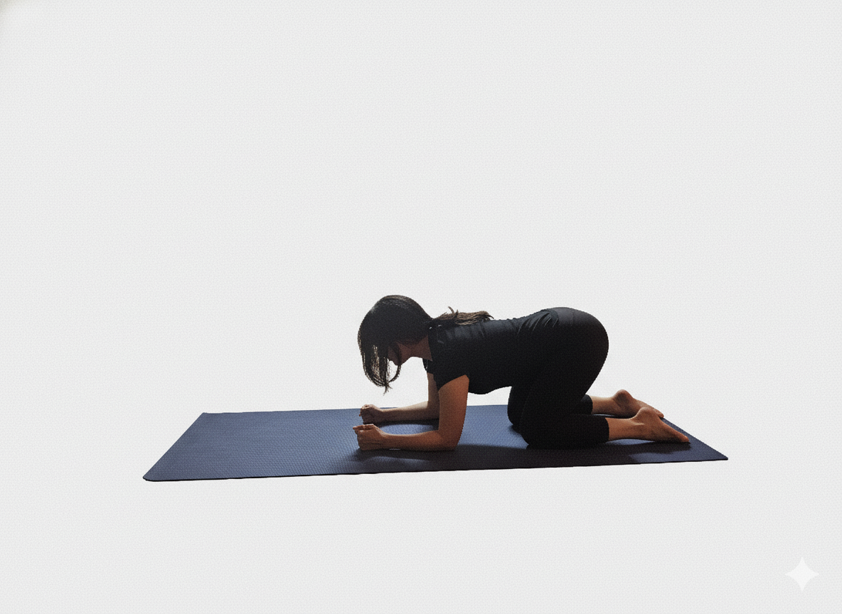 ✨ STEP 2 팔꿈치 위치기본 정렬 잡기 무릎을 꿇고 앉은 자세에서 앞으로 몸을 숙여 바닥에 팔꿈치를 댄다.