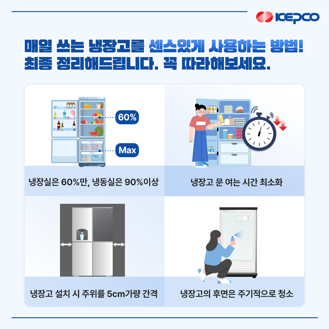 냉장고는 60%만 채우고, 냉동고는 꽉채워 주세요.