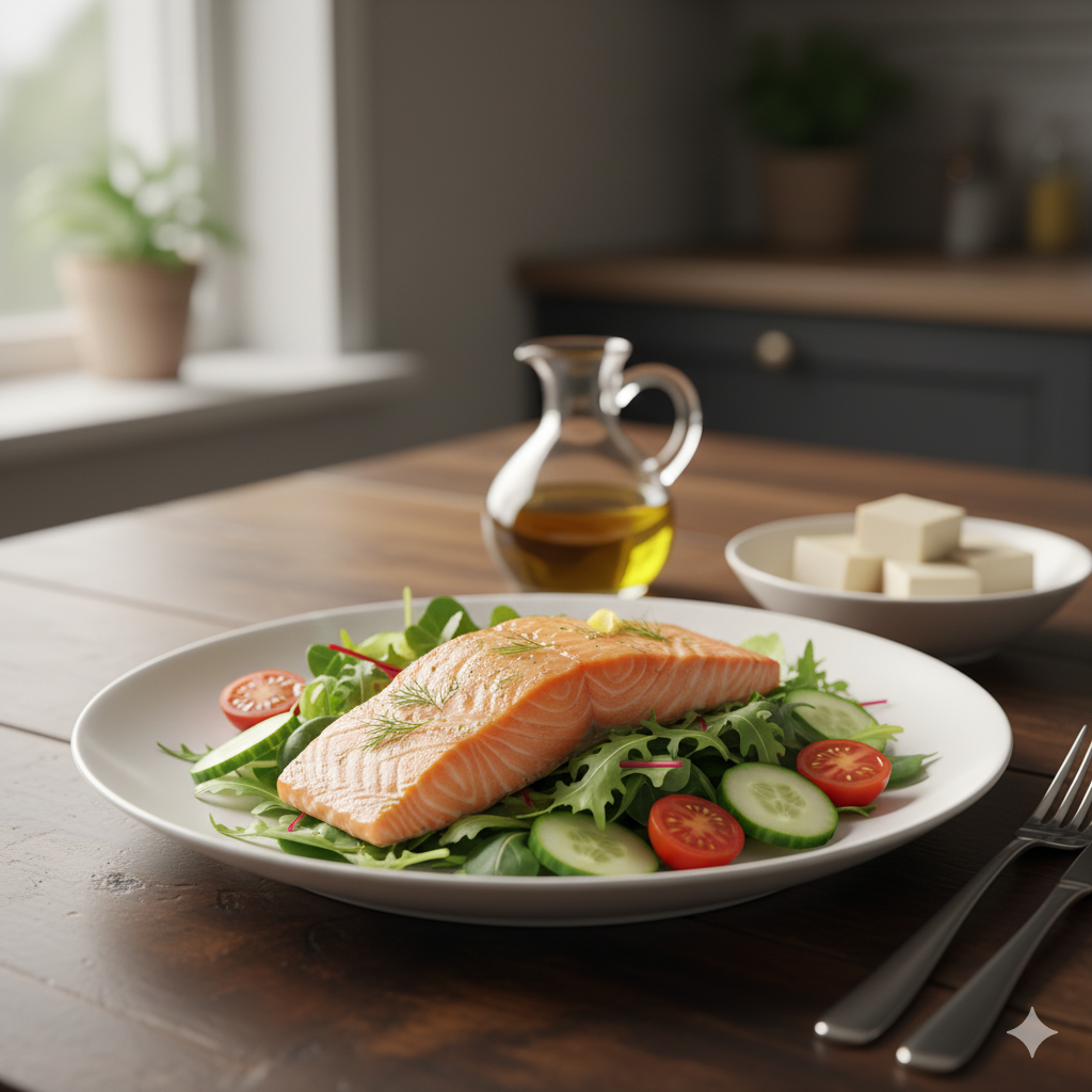 - 저녁: 연어 샐러드와 올리브오일 드레싱, 두부.