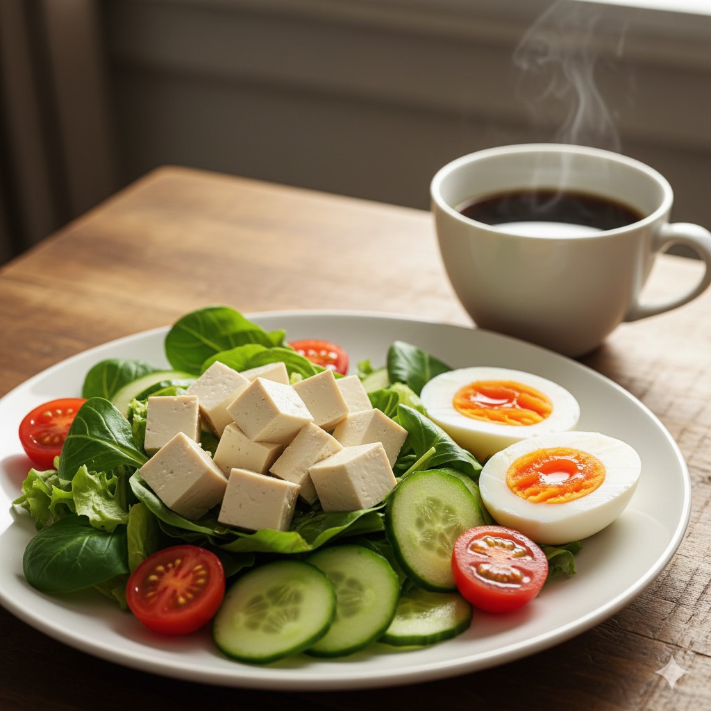 - 아침: 두부샐러드와 삶은 달걀, 블랙커피.