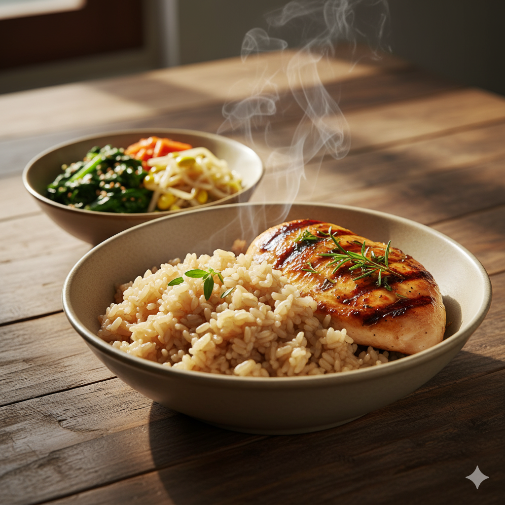 - 점심: 현미밥과 닭가슴살 구이, 나물류.
