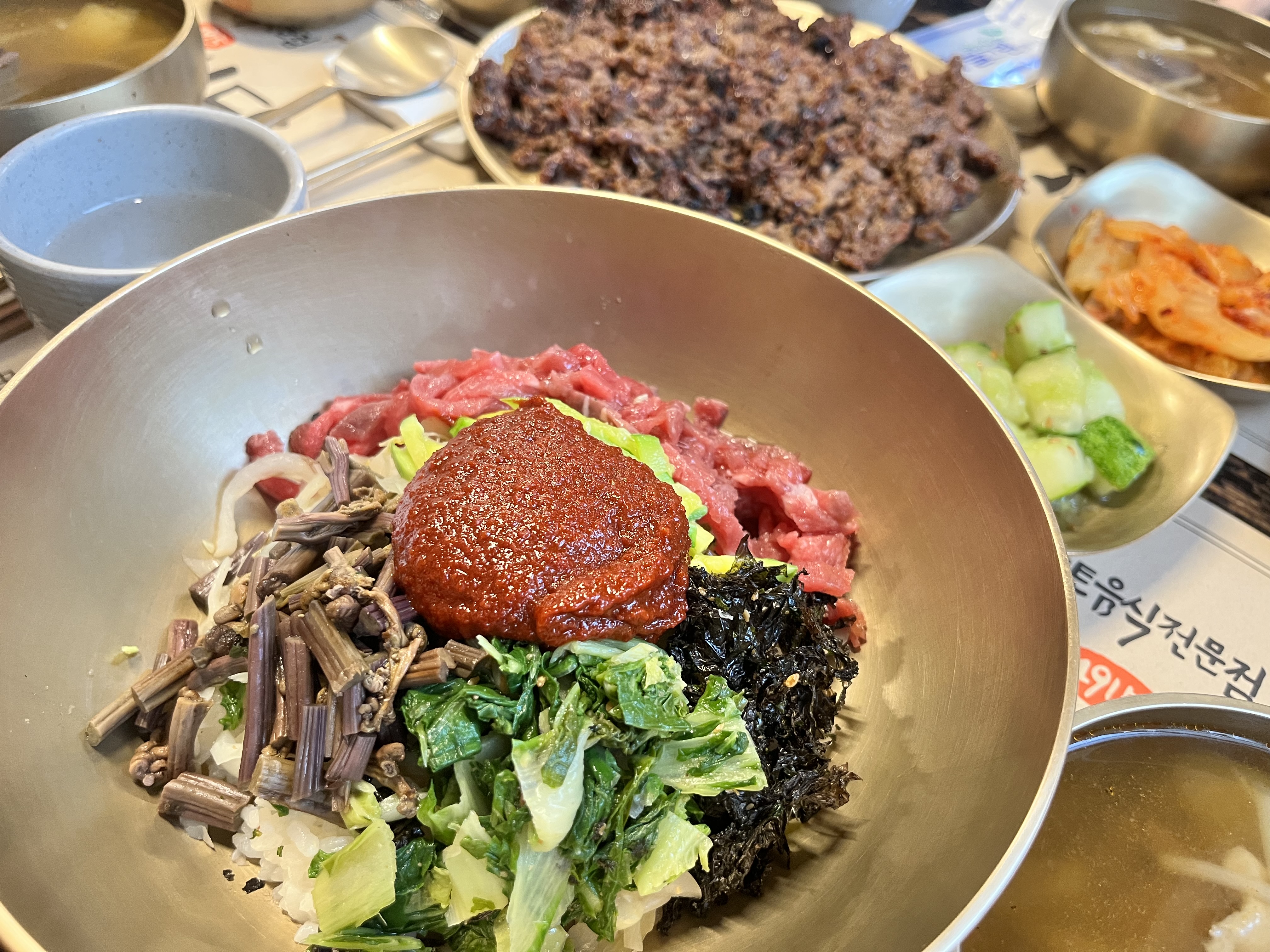 • 육회 외에 따로 육회 메뉴가 있긴 하지만, 비빔밥에도 충분한 양의 육회가 올라가 굳이 따로 주문할 필요 없이 푸짐하게 즐길 수 있습니다.