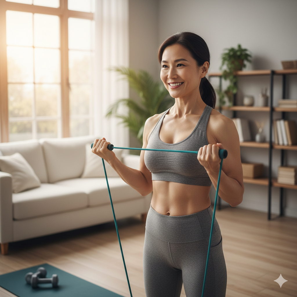 - 집에서 가벼운 아령, 스쿼트, 팔굽혀펴기 등으로 '코어 근육'과 전신 근력을 강화하세요.