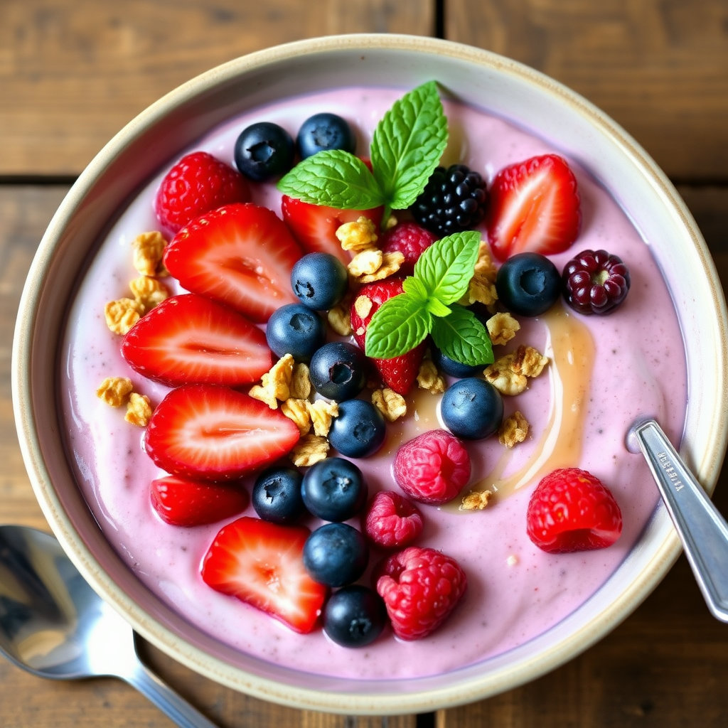 - 그릭 요거트 베리 스무디 볼: 그릭 요거트에 제철 베리류(블루베리, 라즈베리 등)를 갈아 넣고 견과류, 치아씨드를 토핑하여 한 끼 식사 대용으로도 훌륭합니다.